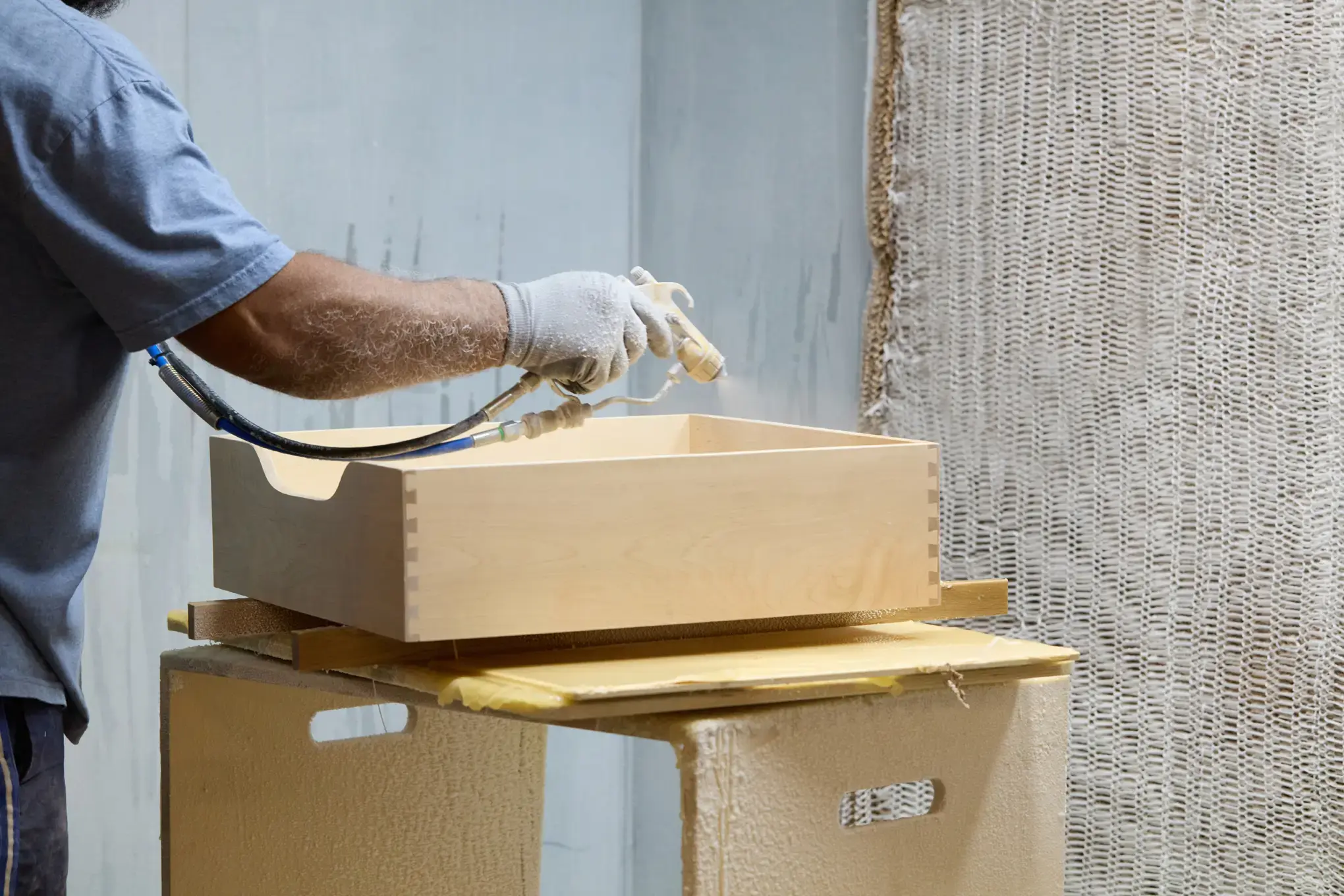 After drawer box assembly and initial prep sanding, we apply two coats of clear pre-catalyzed lacquer by hand to ensure a consistent and smooth finish.