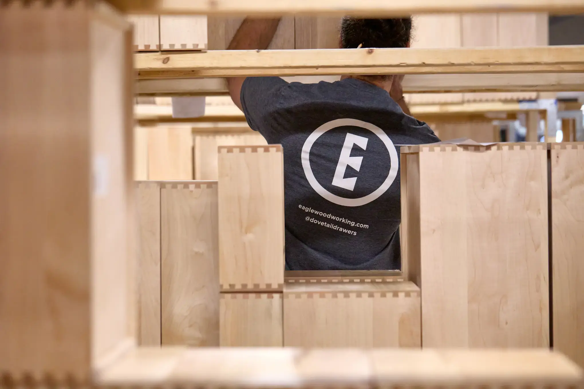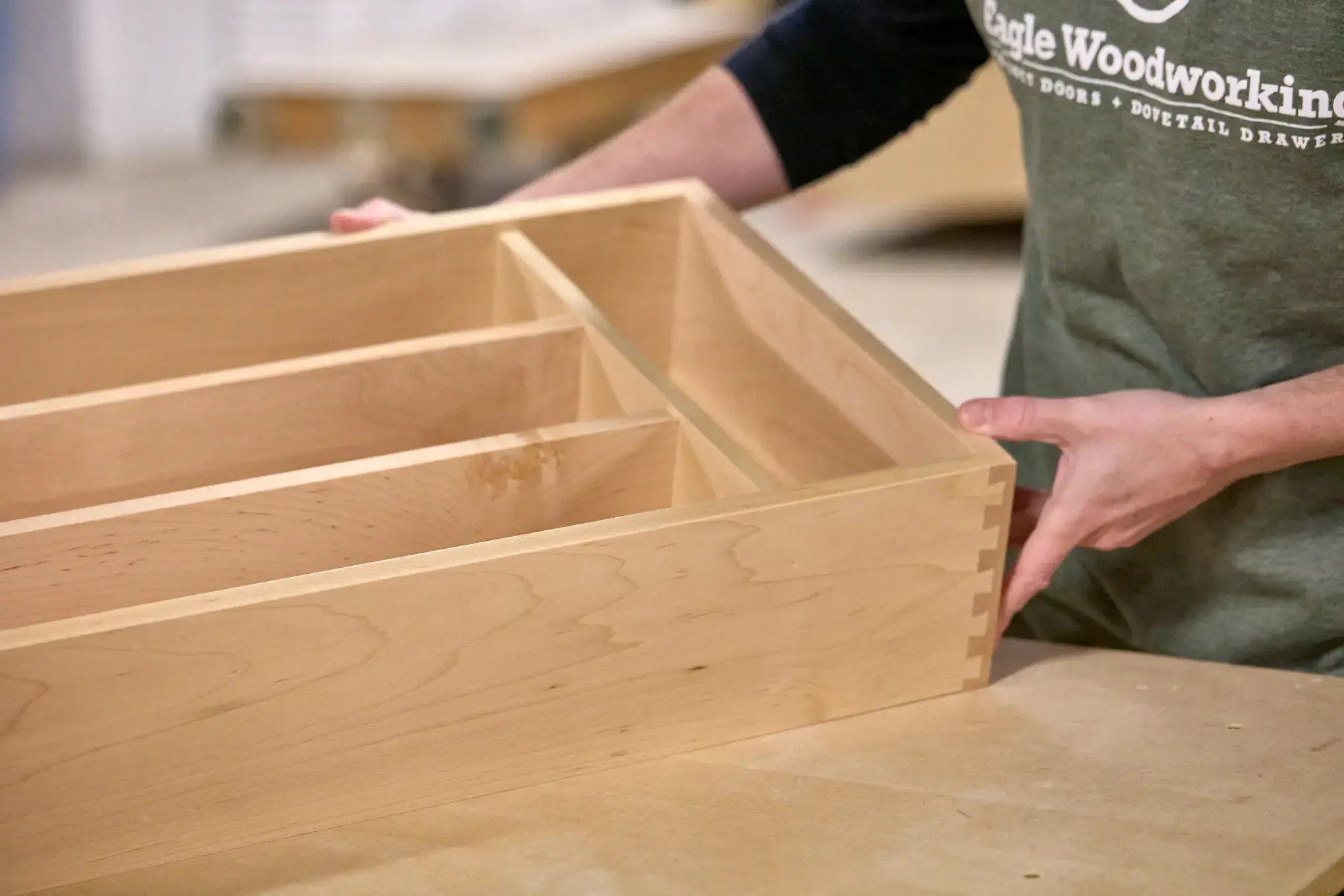 The English dovetail style, which is the style Eagle Woodworking produces, features interlocking joints, which provide greater sturdiness: the key benefit of dovetail drawers. Another benefit of this style is increased storage space.