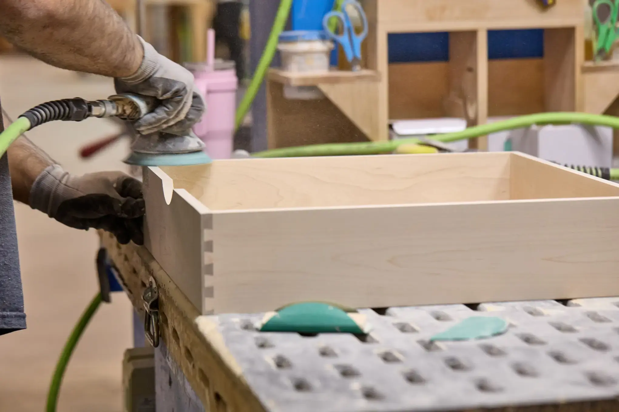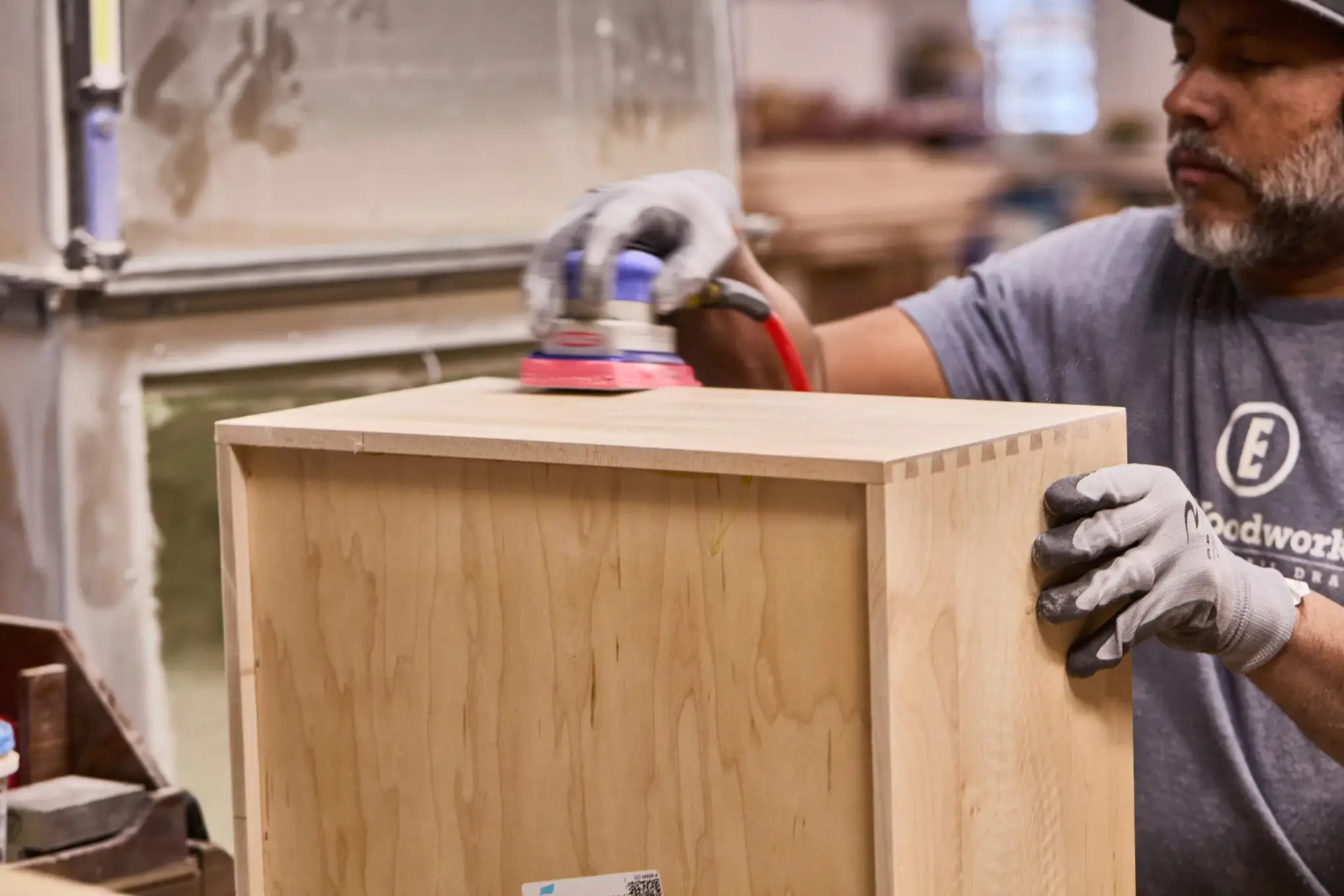 After assembly, drawer sides are run through a side sanding belt, followed by two rounds of top sanding by hand to create a flat, flush top, and a final edge break post-finish.